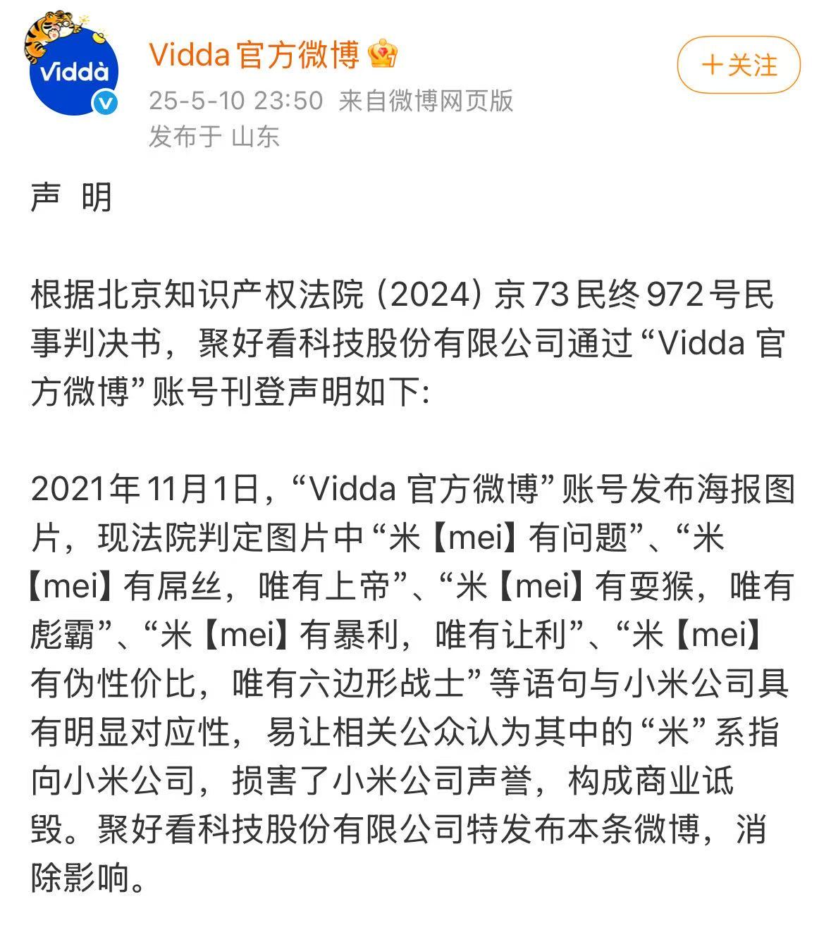 近日,Vidda官微发布声明称:2021年11月1日,“Vidda 官方微博”账号发布海报图片,现法院判定图片中“米【mei】有问题”、“米【mei】有屌丝,唯有上帝”、“米【mei】有耍猴,唯有彪霸”等语句与小米公司具有明显对应性,易让相关公众认为其中的“米”系指向小米公司,损害了小米公司声誉,构成商业诋毁。聚好看科技股份有限公司特发布本条微博,消除影响。