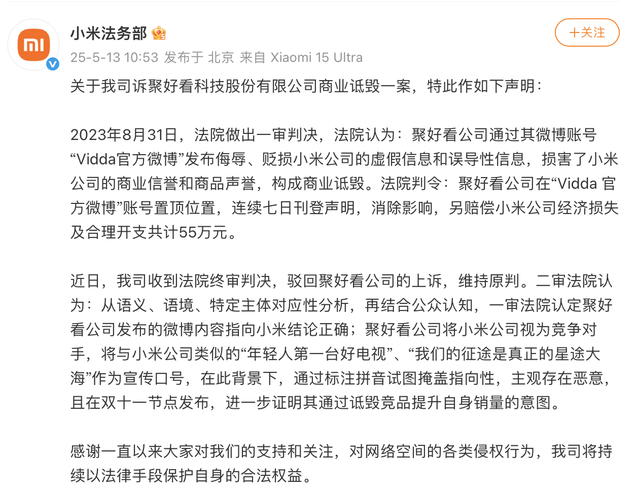 5月13日,小米集团法务部在官方微博上发文称,关于公司诉聚好看科技股份有限公司商业诋毁一案,2023年8月31日,法院做出一审判决,法院认为:聚好看公司通过其微博账号“Vidda官方微博”发布侮辱、贬损小米公司的虚假信息和误导性信息,损害了小米公司的商业信誉和商品声誉,构成商业诋毁。