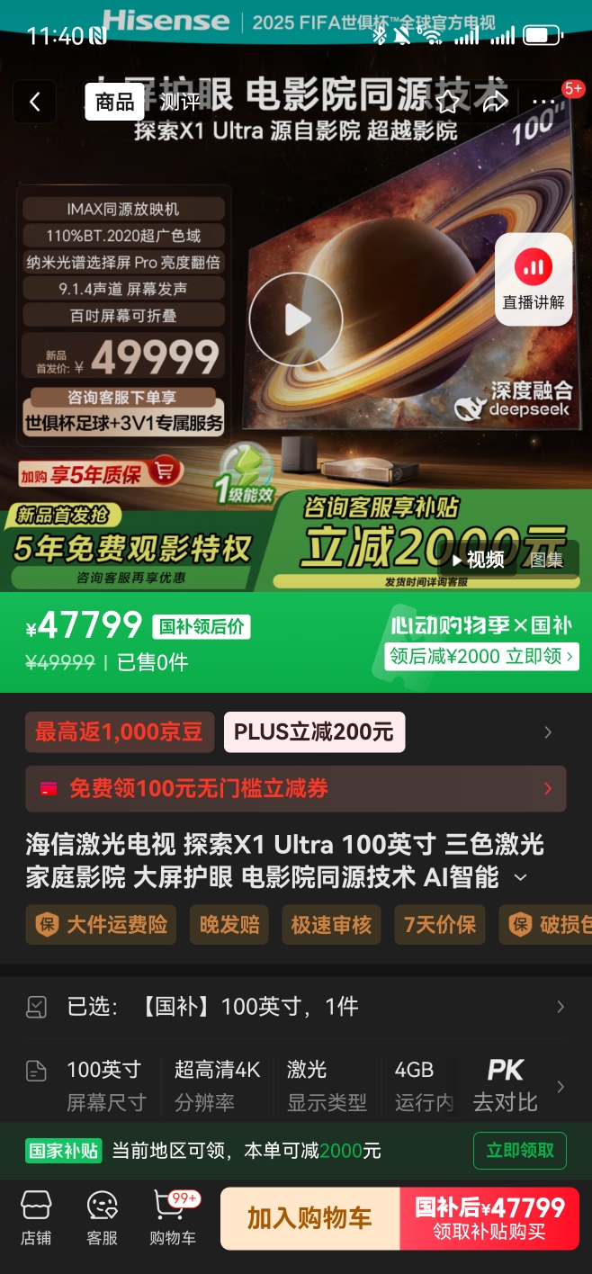 这个定价严重失误,发布以来一台都没卖出,100寸激光电视卖5W,脱离市场需求,僵