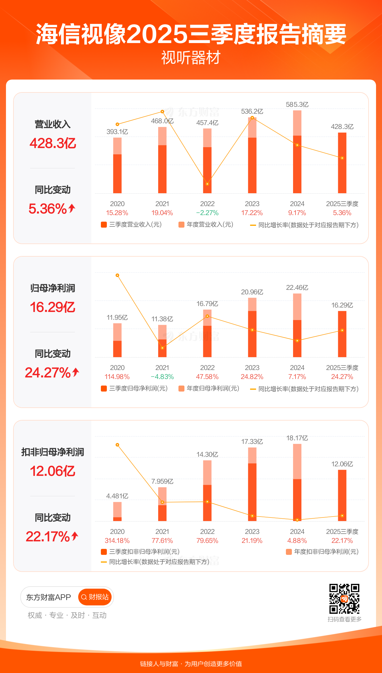 海信视像10月30日发布2025年三季报显示,公司前三季实现营业收入428.30亿元,同比增长5.36%;归母净利润16.29亿元,同比增长24.27%;扣非归母净利润12.06亿元,同比增长22.17%。