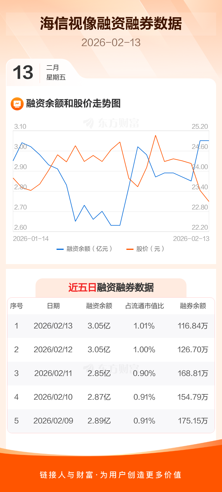 交易所最新数据显示,海信视像于2026年2月13日获融资买入2023.96万元,融资偿还2084.65万元,当日融资净偿还60.69万元。目前,该股融资余额3.05亿,占流通市值比例为1.01%。