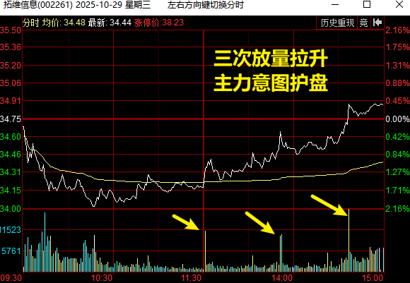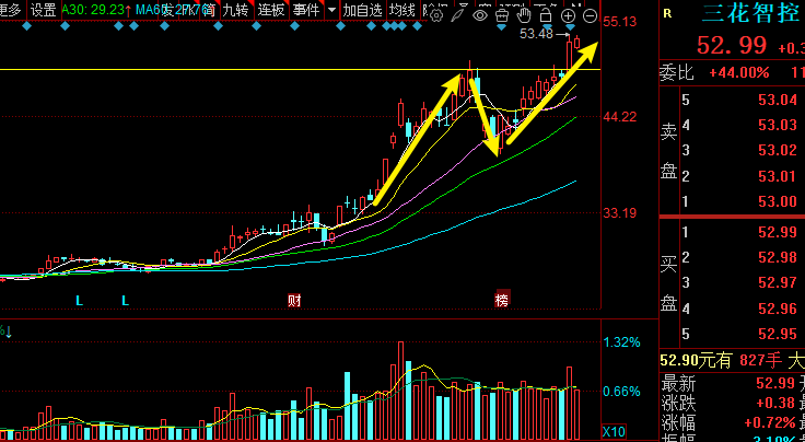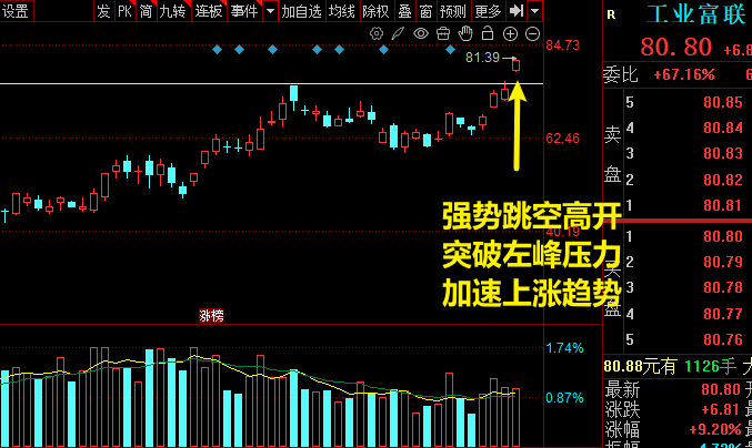 昨天早盘低开低走,下午走出一波放量拉升的行情,这一波的上张出现了三次高量柱,这是主俚在托底,在护盘的讯号,同时也代表主俚吹响了进攻的号角!