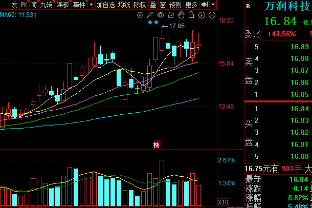 昨天股价再次冲高回落,收出长上影线,下方成交量缩量,目前主俚洗盘意图很明显,大家去看下近期万润的K线图,会发现有很多长上影线和长下影线,这都是主俚有意为之,向上洗套牢盘,向下洗跟风盘,策略是持股不动,等主俚洗完盘后就会进入拉升阶段。