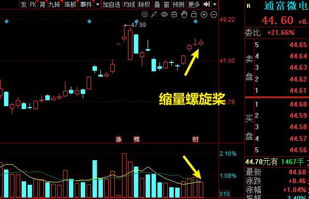近期股价在减持大跌之后,已走出了四连阳的修复性行情,昨天股价收出缩量螺旋桨,在K线理论中,螺旋桨属于变盘讯号,接下来突破前高压力位47.99,将会走出新一级别的加速上张行情,继续持股待张!