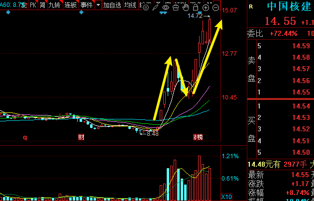 核建的已经有17%,昨天收出8%的大阳线,股价继续创新高,从分时图上看,盘中张停但没有封板,说明市场还是有一定分歧,明天势必有一场腥风血雨,到底是多方胜还是空方胜目前还不清楚,需要多去注意量价的变化。