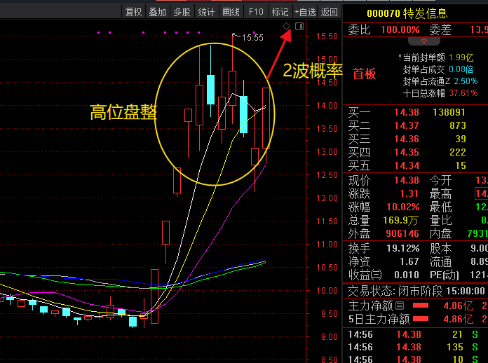特发信息:这个票牧风在前面1波时吃过3个板,高位盘整后,2次参与没把握好,割了5个点。但一直觉得它是一次高低位的换手,只是受限于整体行情,盘整时间有点长,今天算启动板,扫板参与这个老伙计了。