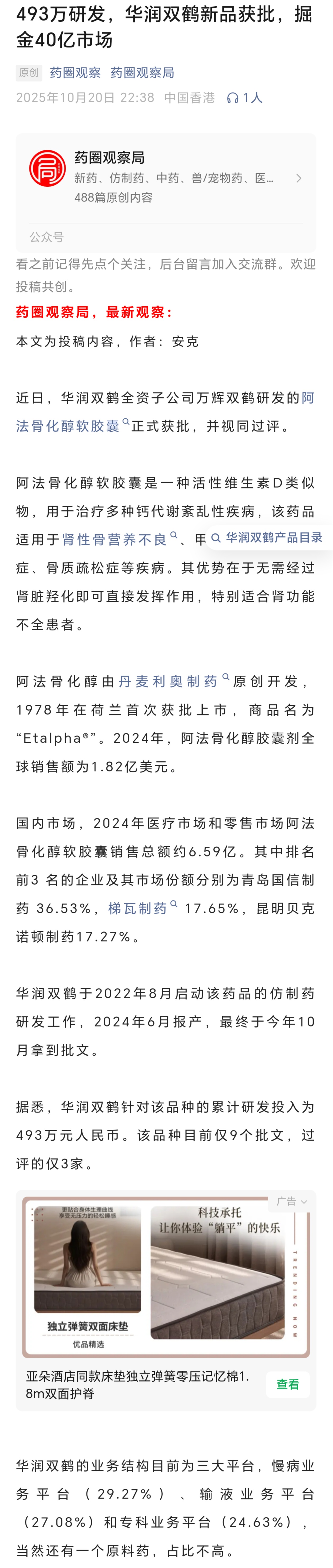 $华润双鹤(SH600062)$ 493万研发,华润双鹤新品获批,掘金40亿市场