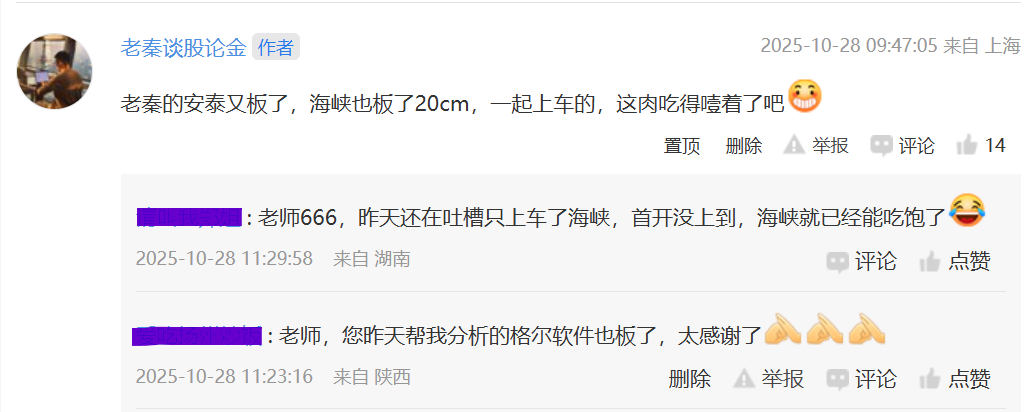 老秦分享的安泰科技,海峡创新双双吃连板,后者还是20CM的大板。前者是我连吃两个中阴时都坚持强烈看好的,后者是昨日早盘竞价直接在留言区分享给大家的。