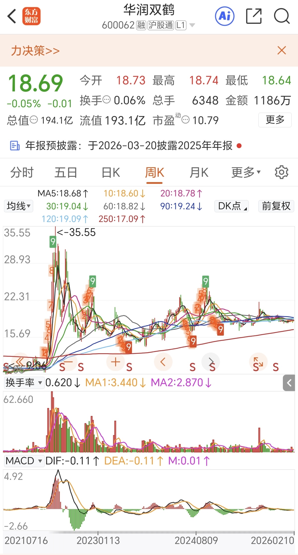 $华润双鹤(SH600062)$ 没有成交量,是不大可能跃上年线(18.82),半年线的(18.94)。这里均线密集,围绕在年线和半年线之间,不停的试盘,但换手率仅0.7%左右,参考历史换手率3%