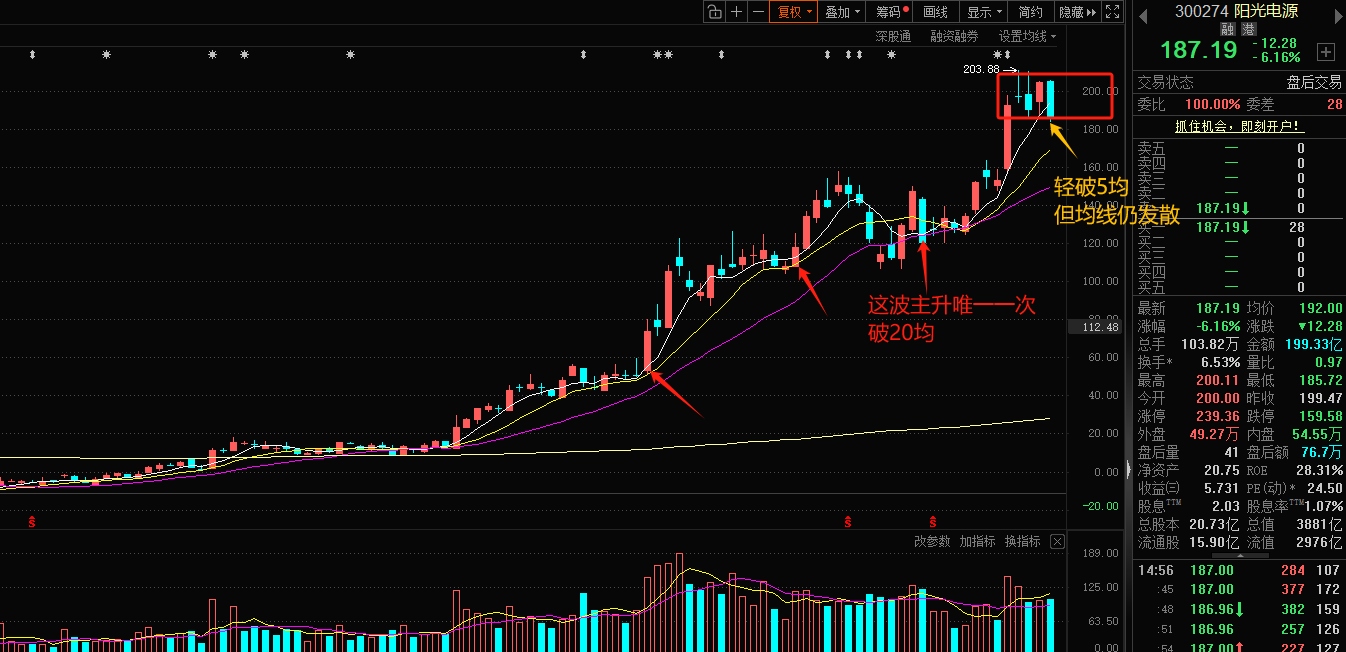 阳光电源300274:今天整体依然是缩量的,虽然破了5均,但是目前也还在区间震荡内。而且均线也仍是发散状态。所以打算多看一天,明天如果不能修复反包再考虑先撤。公司基于光伏逆变器应用开发了全球首台35KV直挂的光伏逆变器,基于光储充应用的多端口SST能量路由器,后期会持续研究和开发该技术的相关应用。