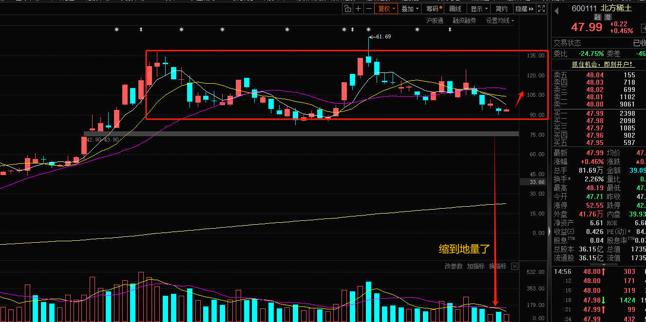 北方稀土600111:短期已经缩到地量了,这是要变方向,但是短期又下不去了,刚好也在高位震荡区间的下轨,所以今天看反弹。不过要看力度是否强。这样才能大概知道后面反弹的快慢以及是否值得等。