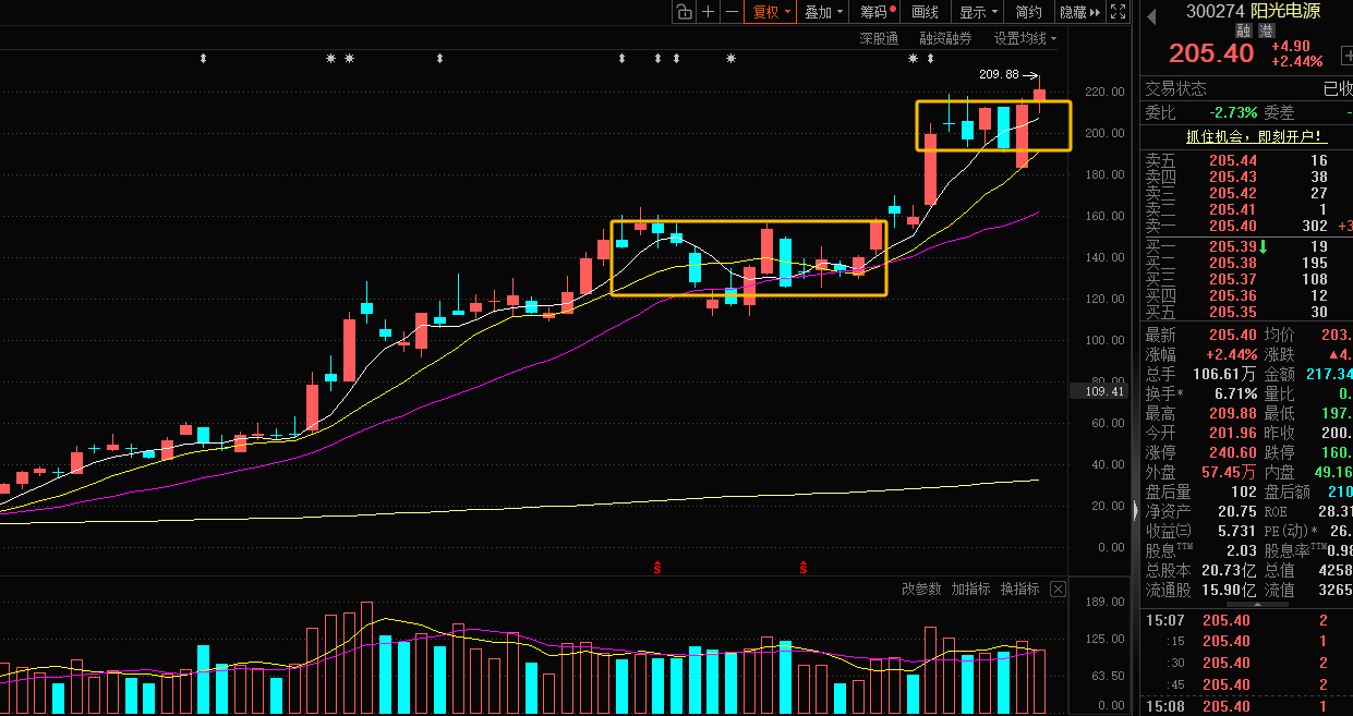 阳光电源300274:昨天已经冲出了高位盘整,虽然没怎么放量,但是至少再度新高了,不破5均的前提下,可以再等一个加速大阳就考虑撤了。
