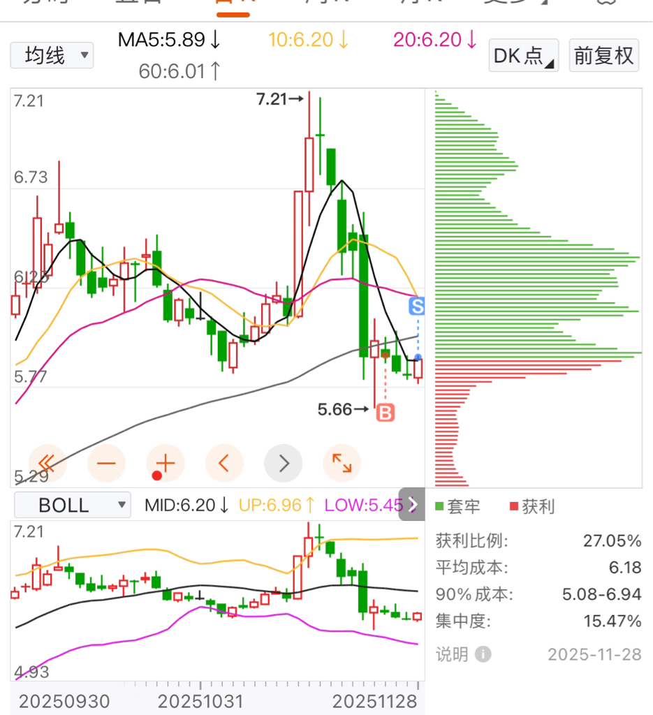 $皖维高新(SH600063)$ 布林线转头向下,要去摸下轨了,今天最后一天卖出机会