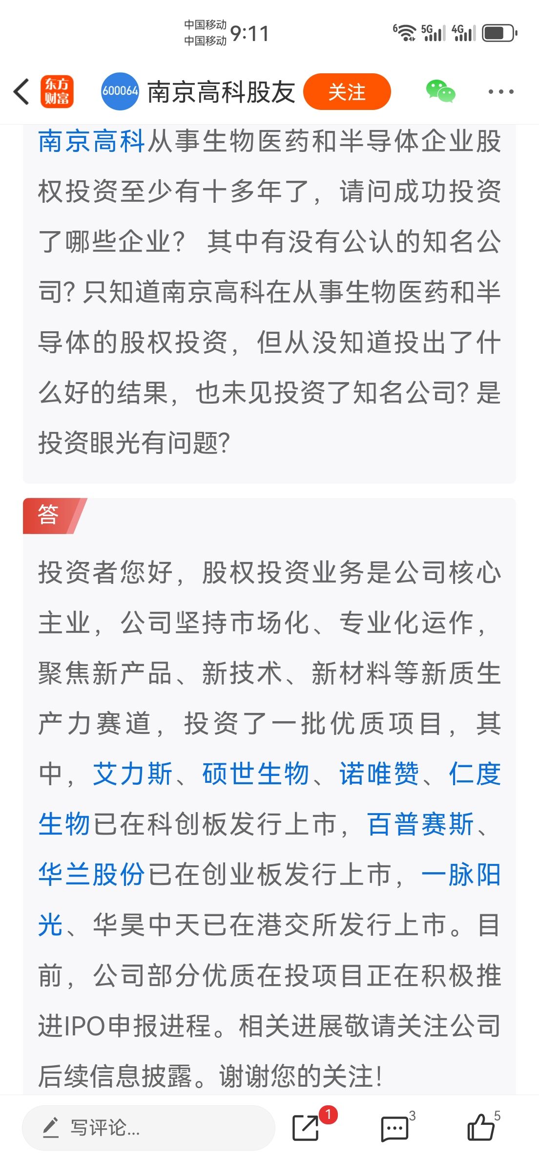 南京高科从事生物医药和半导体企业股权投资至少有十多年了,请问成功投资了哪些企业? 其中有没有公认的知名公司? 只知道南京高科在从事生物医药和半导体的股权投资,但从没知道投出了什么好的结果,也未见投资了知名公司? 是投资眼光有问题?答投资者您好,股权投资业务是公司核心主业,公司坚持市场化、专业化运作,聚焦新产品、新技术、新材料等新质生产力赛道,投资了一批优质项目,其中,艾力斯、硕世生物、诺唯赞、仁度生物已在科创板发行上市,百普赛斯、华兰股份已在创业板发行上市,一脉阳光、华昊中天已在港交所发行上市。目前,公司部分优质在投项目正在积极推进IPO申报进程。相关进展敬请关注公司后续信息披露。谢谢您的关注!