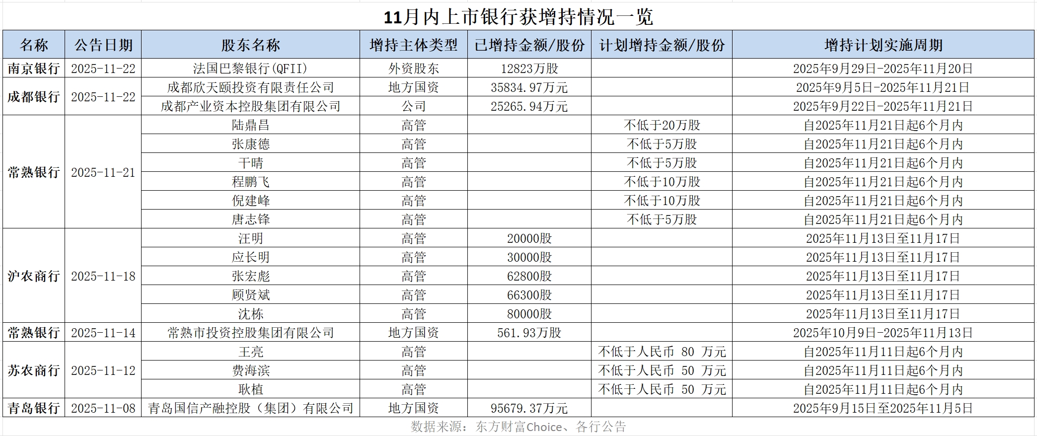 2025年11月以来,A股上市银行迎来新一轮股东增持浪潮。