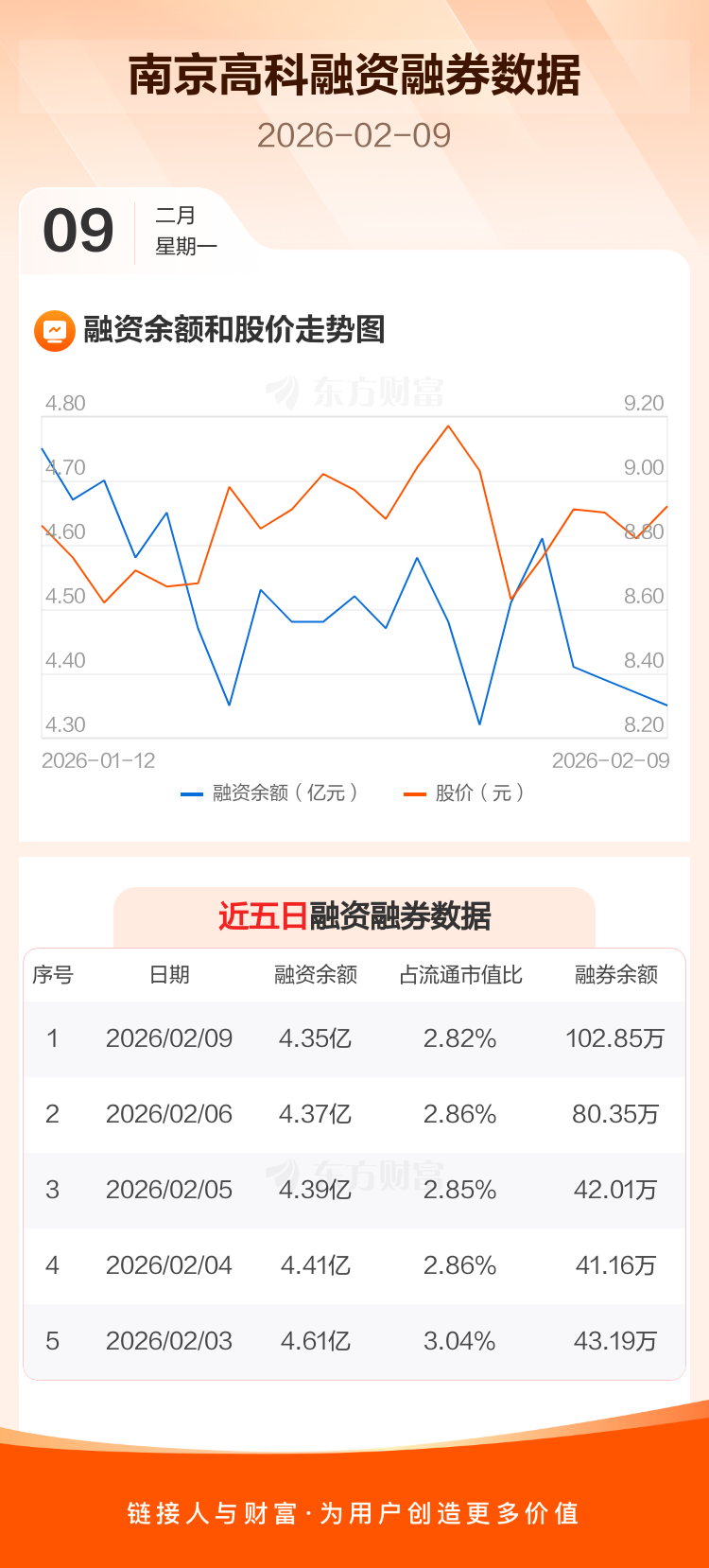 交易所最新数据显示,南京高科于2026年2月9日获融资买入2381.56万元,融资偿还2603.54万元,当日融资净偿还221.98万元。目前,该股融资余额4.35亿,占流通市值比例为2.82%。