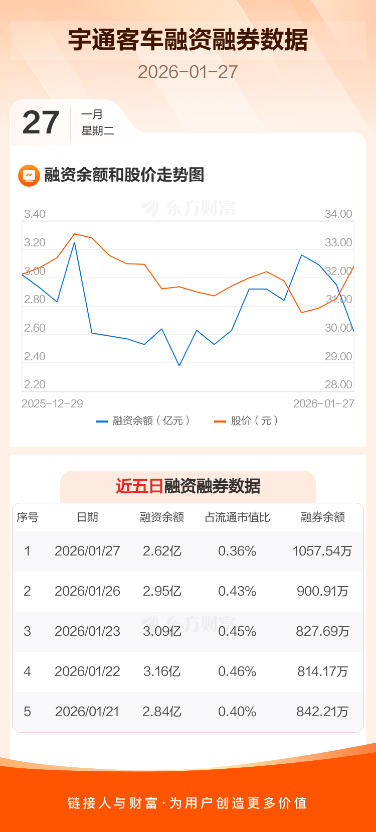 交易所最新数据显示,宇通客车于2026年1月27日获融资买入1289.22万元,融资偿还4569.00万元,当日融资净偿还3279.78万元。目前,该股融资余额2.62亿,占流通市值比例为0.36%。