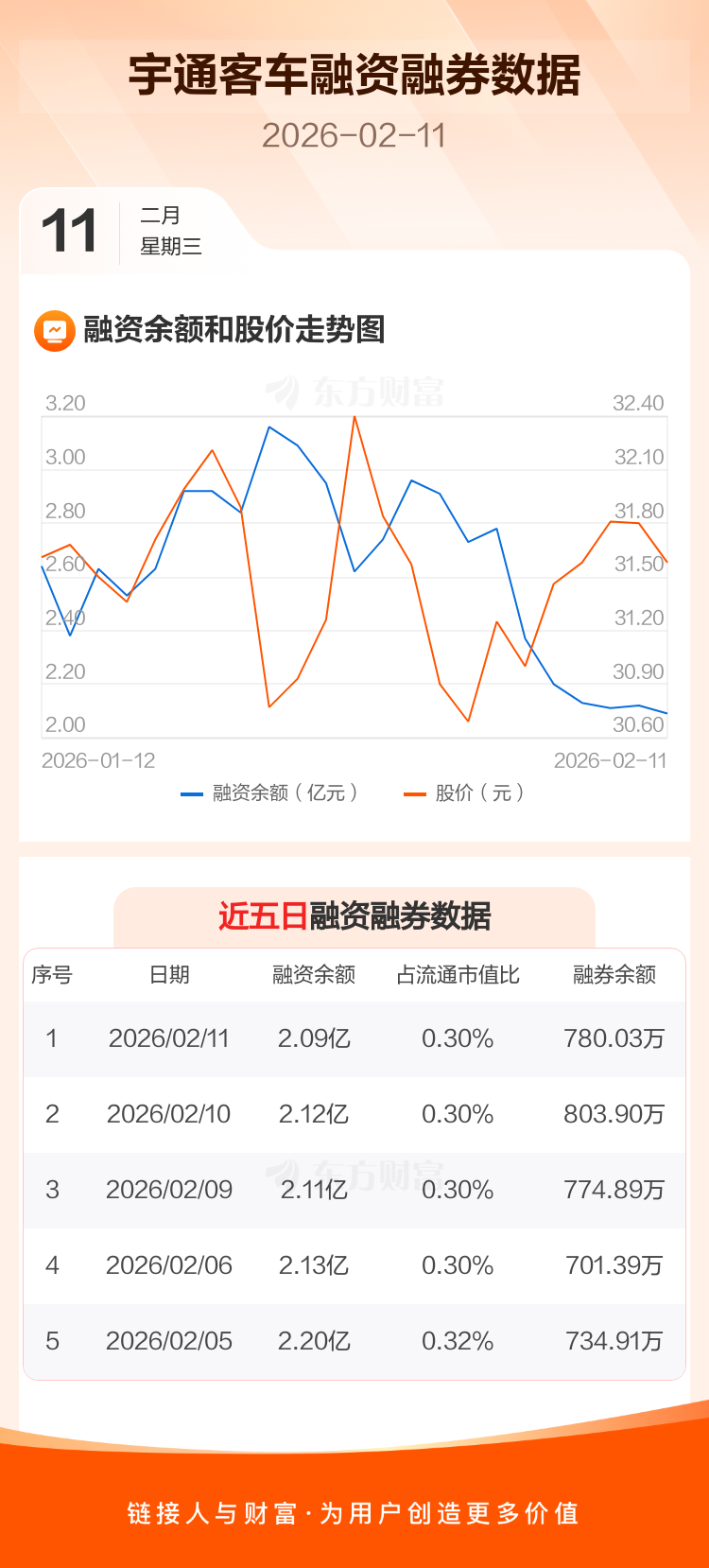 交易所最新数据显示,宇通客车于2026年2月11日获融资买入1030.53万元,融资偿还1285.47万元,当日融资净偿还254.95万元。目前,该股融资余额2.09亿,占流通市值比例为0.30%。