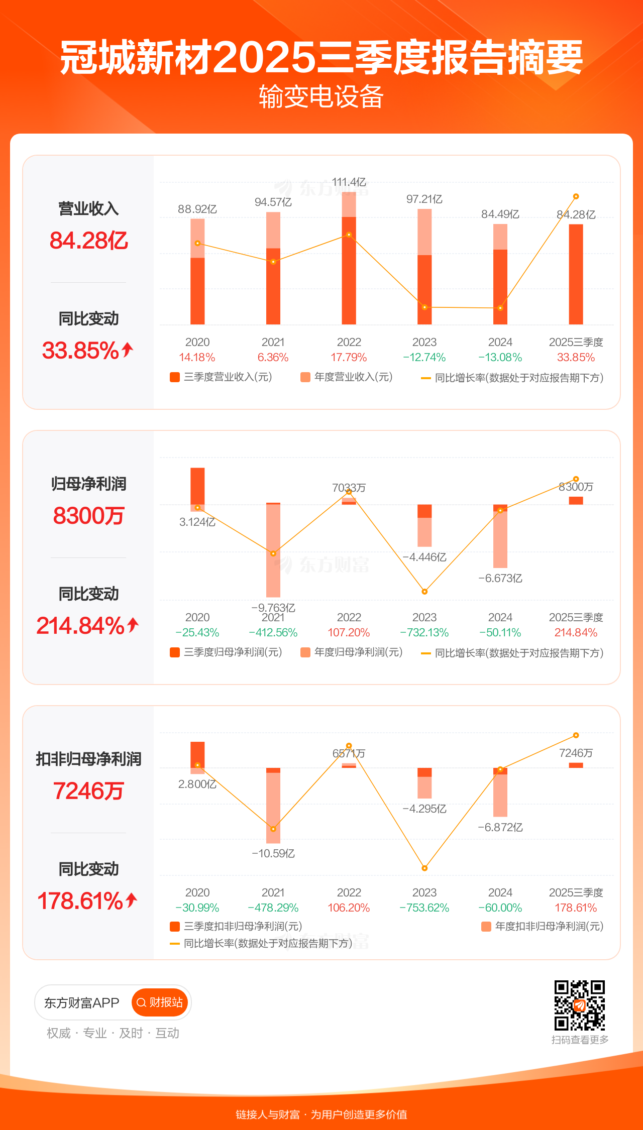 冠城新材10月31日发布2025年三季报显示,公司前三季实现营业收入84.28亿元,同比增长33.85%;归母净利润8300.30万元,同比增长214.84%;扣非归母净利润7246.18万元,同比增长178.61%。