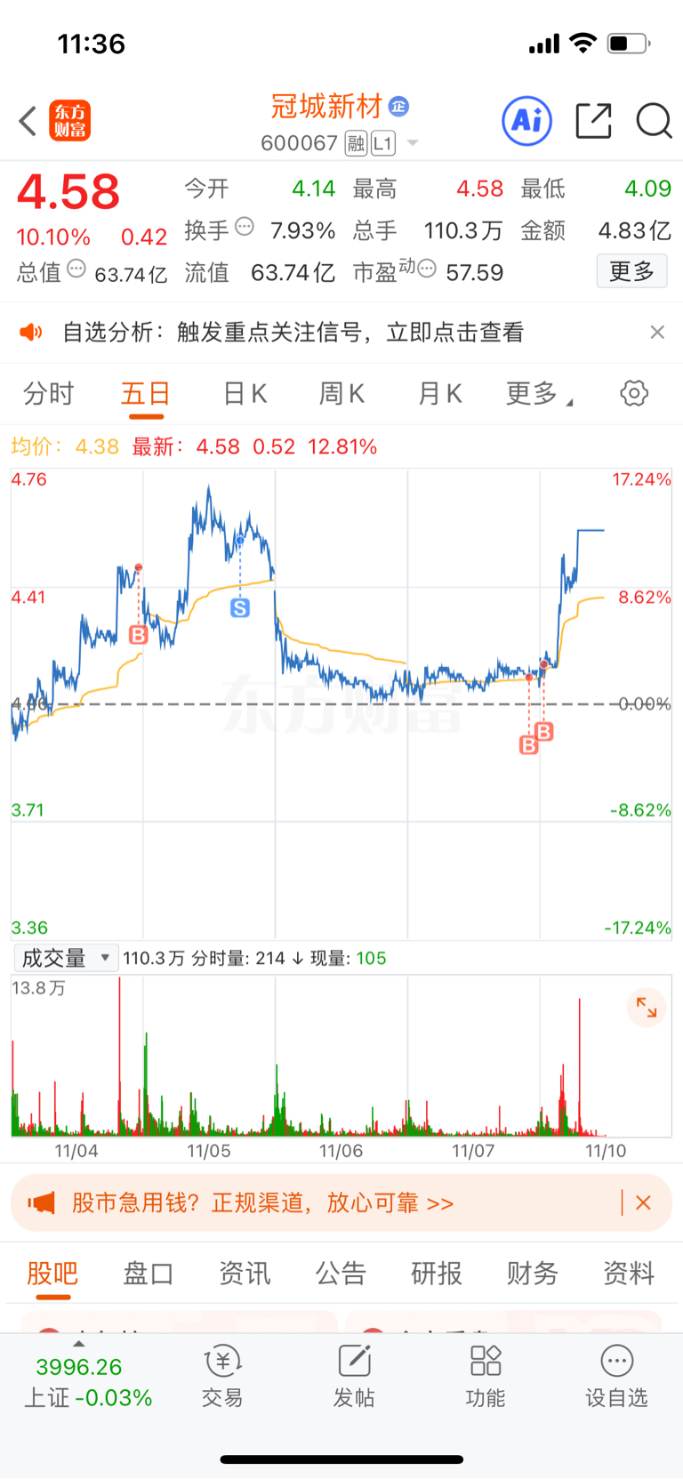 $冠城新材(SH600067)$ 11、4号刚买进就后悔了、还好第二天有拉高给我走了