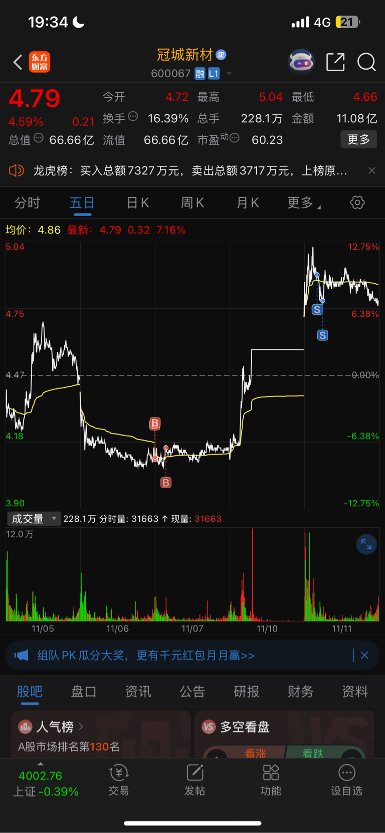 $冠城新材(SH600067)$ 今天的量应该是短期顶部,过两天再来加仓