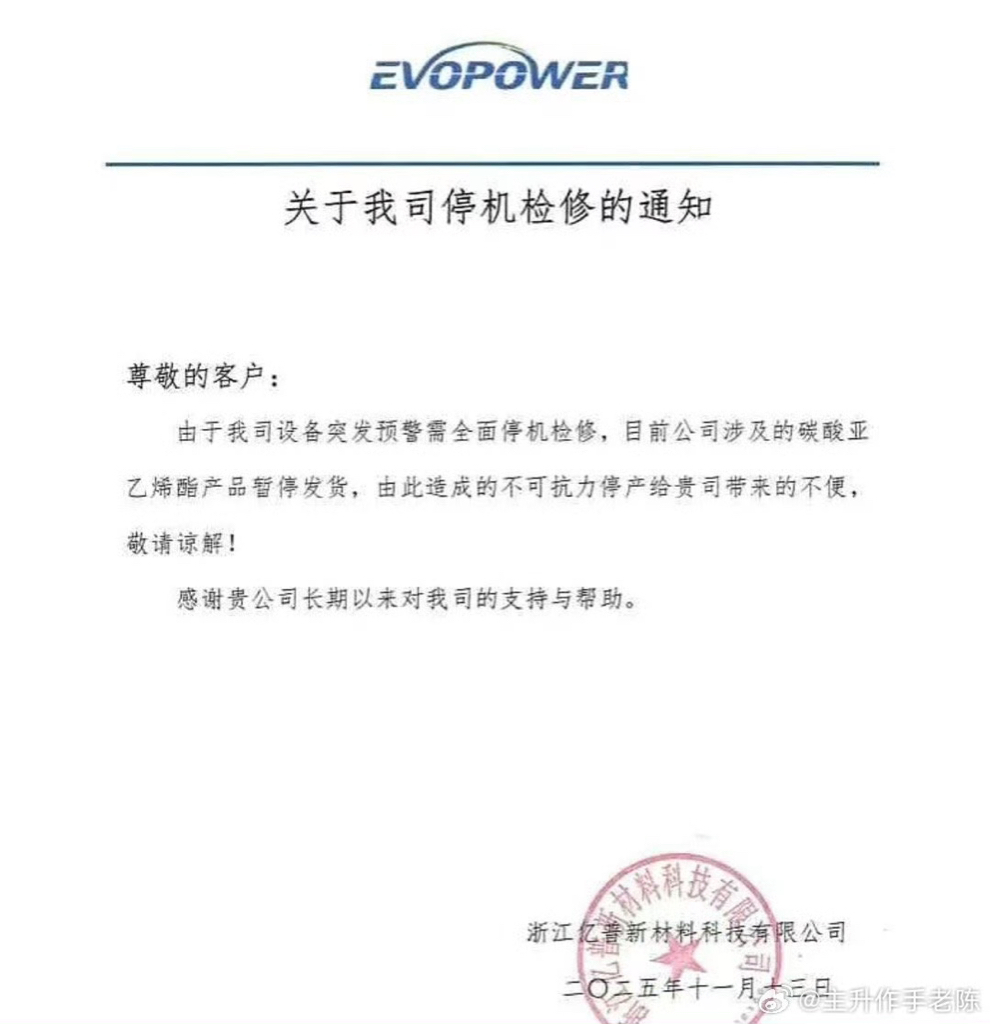 11月13日,浙江亿普发布停产公告。公告称由于设备突发预警需全面停机检修,目前V