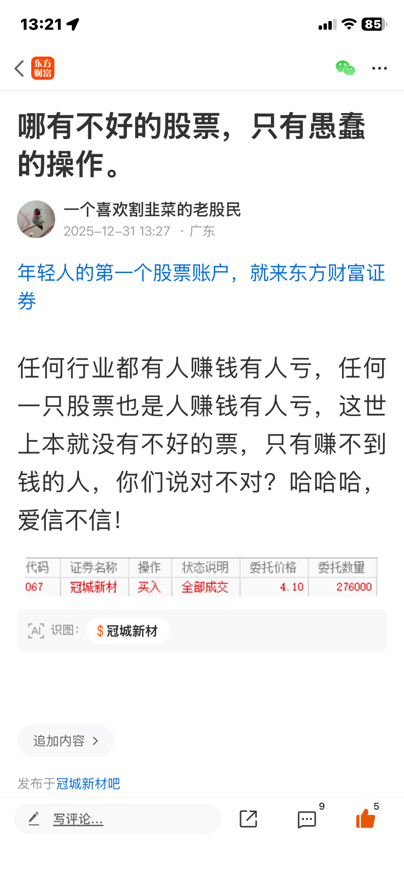 温馨提示: 1.根据《证券法》规定,禁止编造、传播虚假信息或者误导性信息,扰乱证券市场;2.用户在本社区发表的所有资料、言论等仅代表个人观点,与本网站立场无关,不对您构成任何投资建议。用户应基于自己的独立判断,自行决定证券投资并承担相应风险。《东方财富社区管理规定》