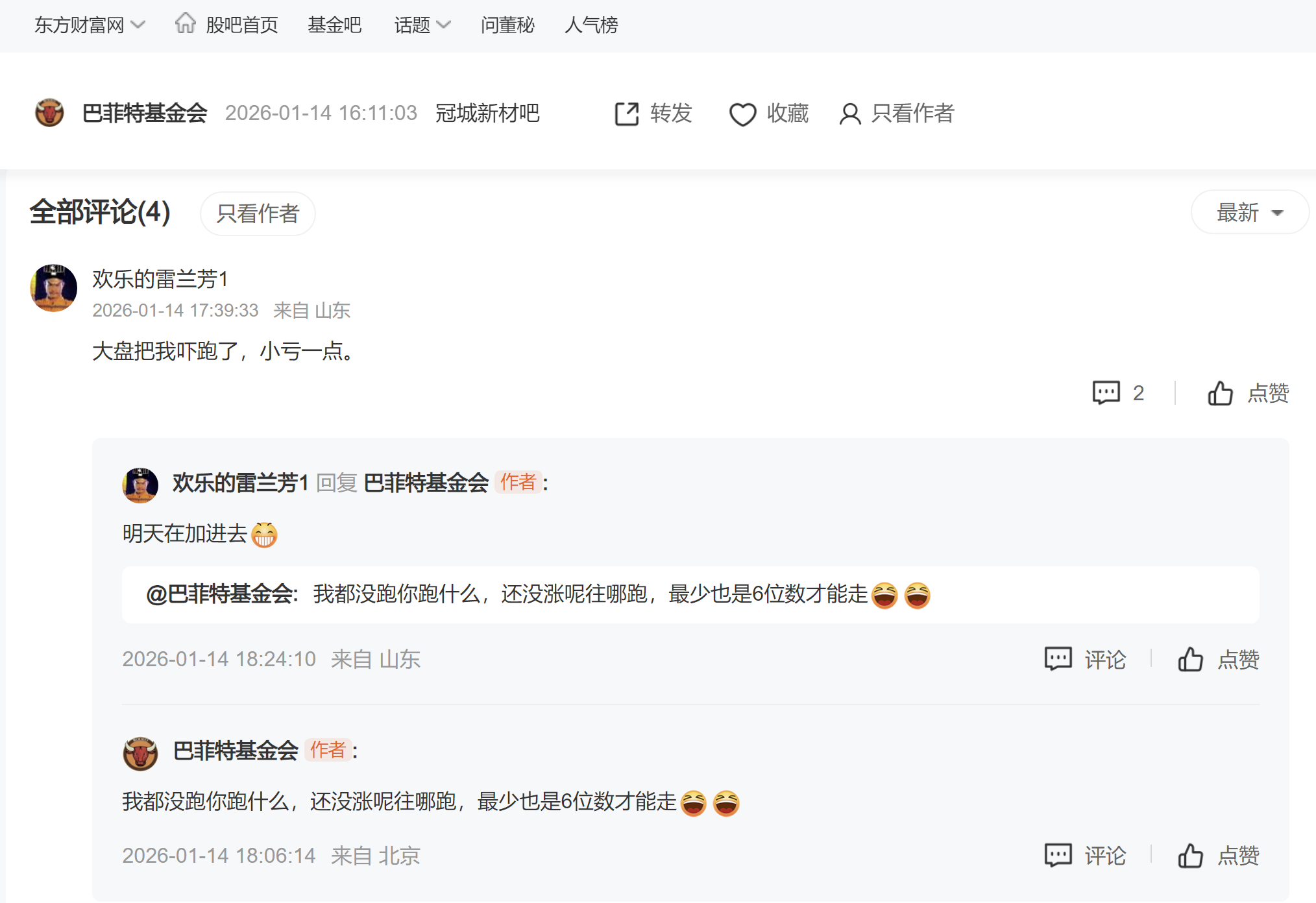 温馨提示: 1.根据《证券法》规定,禁止编造、传播虚假信息或者误导性信息,扰乱证券市场;2.用户在本社区发表的所有资料、言论等仅代表个人观点,与本网站立场无关,不对您构成任何投资建议。用户应基于自己的独立判断,自行决定证券投资并承担相应风险。《东方财富社区管理规定》