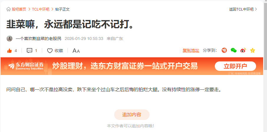 温馨提示: 1.根据《证券法》规定,禁止编造、传播虚假信息或者误导性信息,扰乱证券市场;2.用户在本社区发表的所有资料、言论等仅代表个人观点,与本网站立场无关,不对您构成任何投资建议。用户应基于自己的独立判断,自行决定证券投资并承担相应风险。《东方财富社区管理规定》
