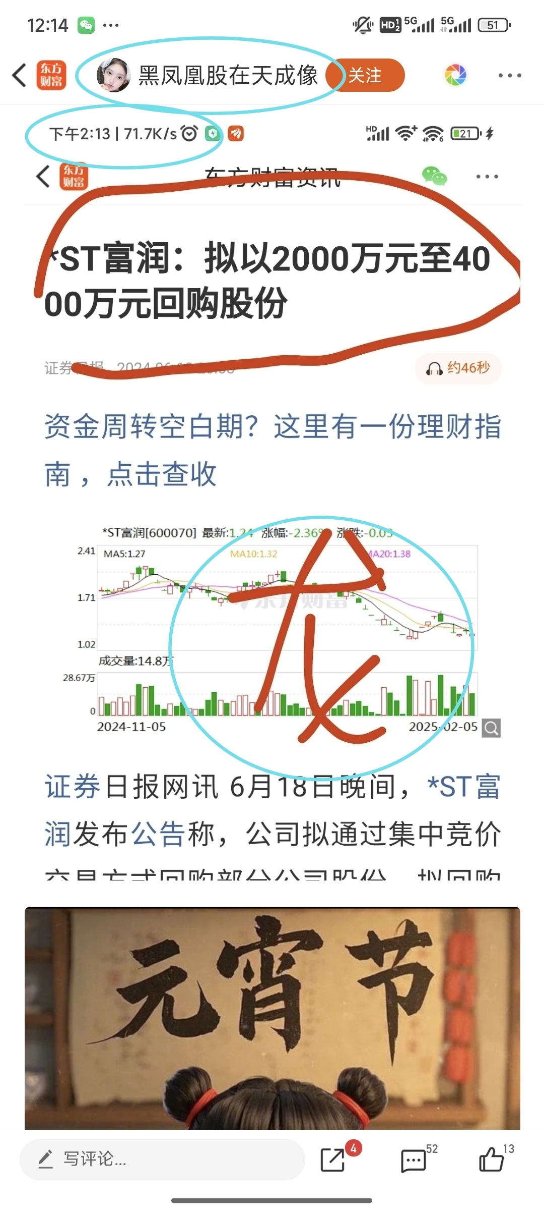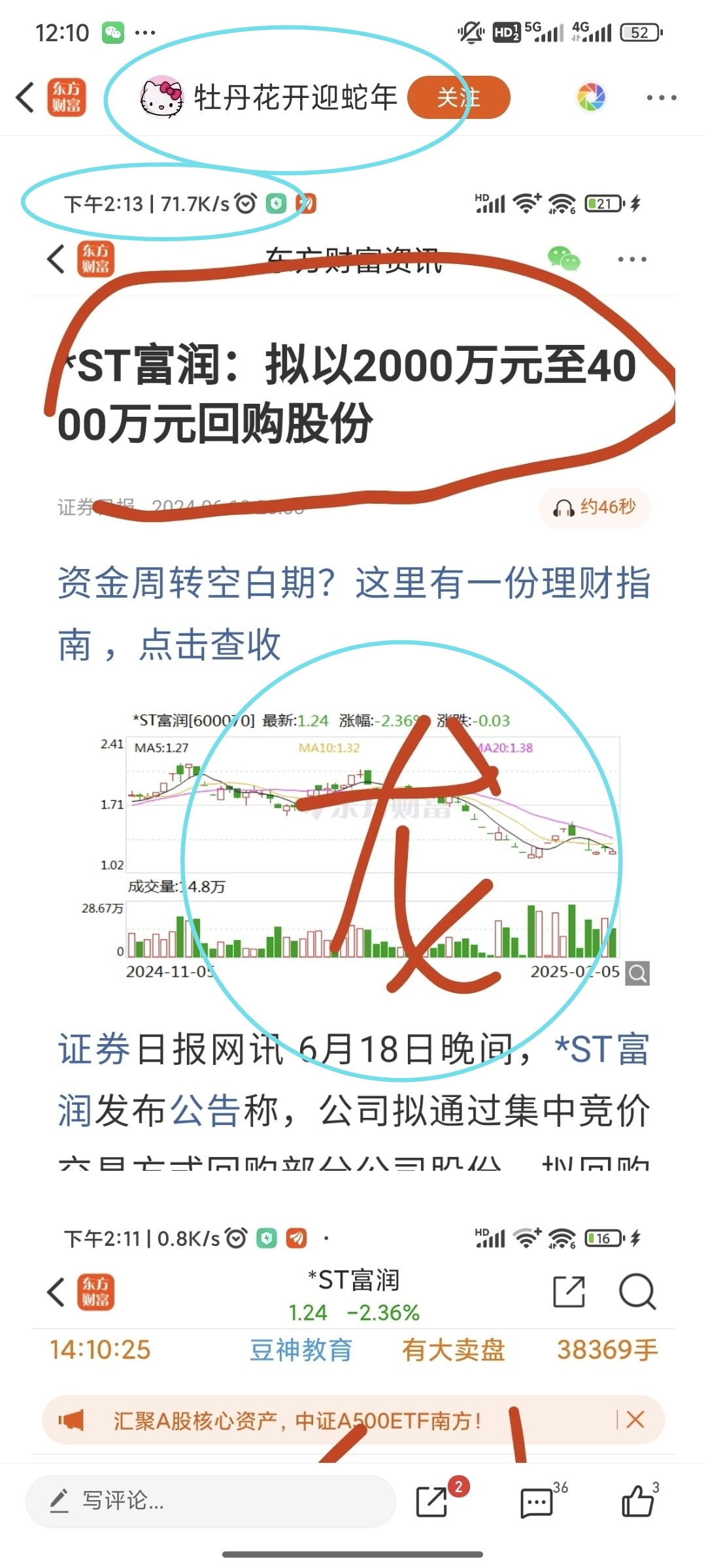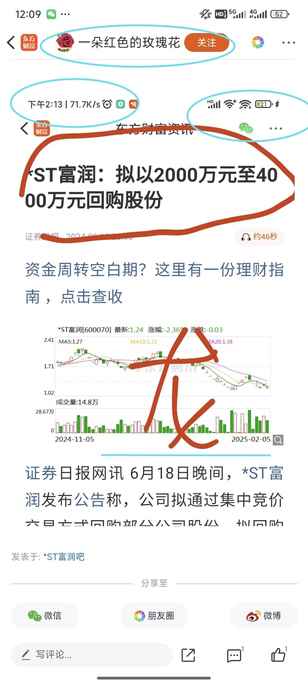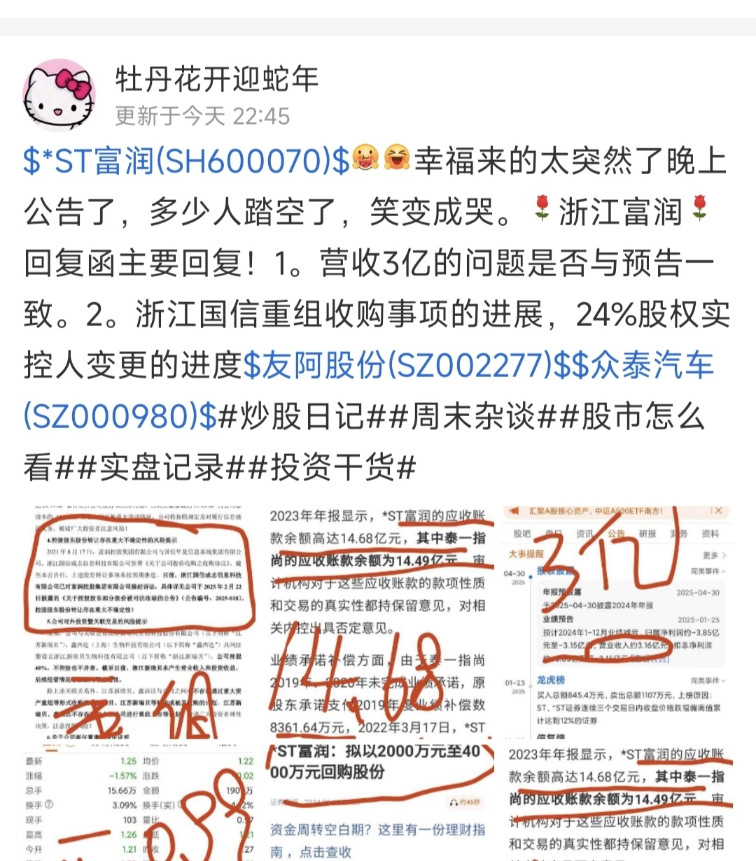$*ST富润(SH600070)$ 这几个人牡丹花、一朵红色玫瑰、邓紫棋、黑色什么的都是同一个团伙,地址都是四川,手法一样都是图片加大红字,无脑唱多,甚至图都一样,几个账户相互评论转发。在座各位都好好想想,如果真是利好庄会花钱请人在这位置无脑唱多?做善事?炒股不是一厢情愿,公告是文字游戏,你看到、理解和假设的都是庄给你铺好的路。