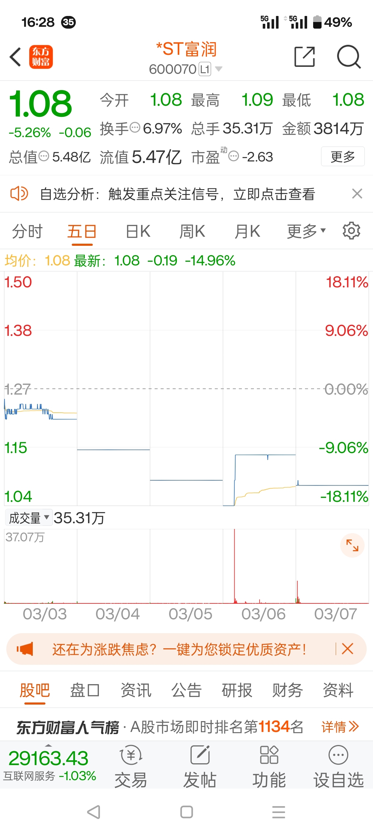 $*ST富润(SH600070)$ 下周的演绎,我来告诉你真相。话说1.27涨停开板那天,庄家就跑了,次日周一大幅度低开,收盘跌停1.21,那是部分先知先觉的散户和庄家跑路。后面周二,是觉醒后的散户跌停1.15卖出,就看封跌停的挂单数量变化就知道,是散户不停挂单排队卖出1.15,封单数量是逐步增加的,最后一字跌停1.15收盘。周三,开盘上来就是几十万手封单,很坚决的封住跌停,那是庄家干的,目的是彻底打消开板的希望。周四,散户绝望了,是绝大多数散户绝望了,一致提前排队挂单1.04卖出,导致开盘就三十万手封跌停。这时候,庄家看到了机会,我数了一下读秒时间,在二十秒的时间内,庄家一口气吃掉了三十多万手封单,随后快速拉上涨停,因为,多数散户没有筹码卖出了,只能眼巴巴的看着涨停1.14发呆。周五,想都不要想,庄家反手把周四1.04买的筹码,挂跌停单1.08卖出,从开盘就是几十万手卖盘封单就可以看出,这绝不是散户行为,因为前一天周四走的是地天板,散户还沉浸在1.04卖出的懊恼之中,还想着怎么买回来呢,所以周五卖出单不可能是散户的,只能是庄家的。那么问题来了,下周周一会怎么走?答案很简单,散户惊魂未定开盘就跌停,价格是1.03。由于部分散户周四1.04卖出急需补仓,庄家也需要补充打压的筹码,所以,周一盘中会迅速打开跌停,拉高见红。下周一是标准的一致转分歧走势,但是,就是这个但是,周一收盘还是跌停。因为庄家不想跟散户抢筹码,也不愿意散户跟他抢筹码,尾市必定竭尽全力打到跌停。时间来到下周二,这时候,经过几轮跌停杀跌,敢于买入的散户已经不多了,而卖出的意愿已经非常强烈,庄家趁势挂单打压开盘在0.98,随后你仔细观察会发现,封单数量逐步增加,那是散户大军纷纷缴械投降了,毕竟跌破1.0退市风险展现了,此时不卖更待何时?于是,庄家出场了,又是一分钟扫货,直接把0.98挂单筹码一扫而空,然后封死在涨停1.08,完成了一个轮回,股价回到了本周五的价格。下周三,涨停,周四,涨停,周五散户搏回复函利好继续涨停,庄家出货。好了,下周剧本就是这样了。看图,下周走上周的对称走势。
