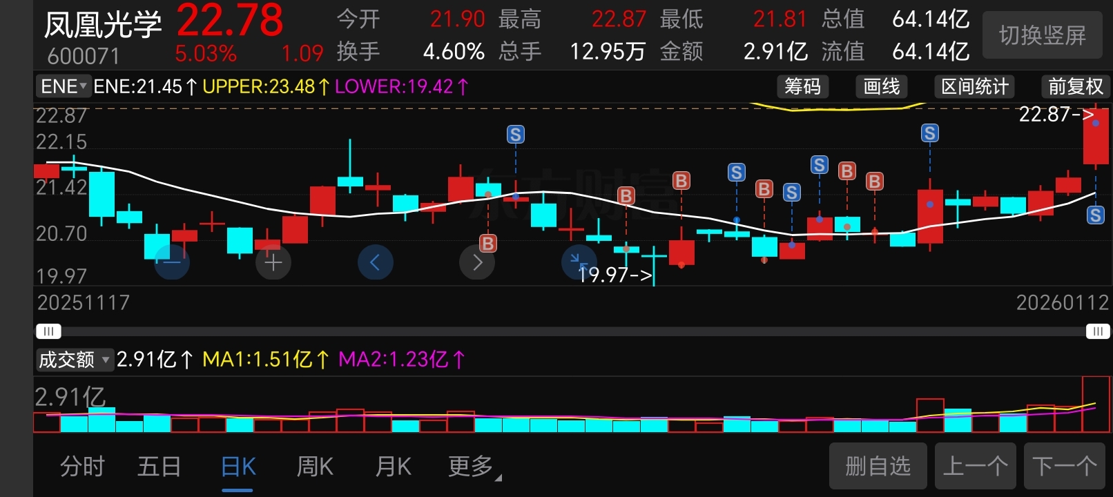 $凤凰光学(SH600071)$ 今倍量阳的三连阳先走为敬,等回调在看。附图。