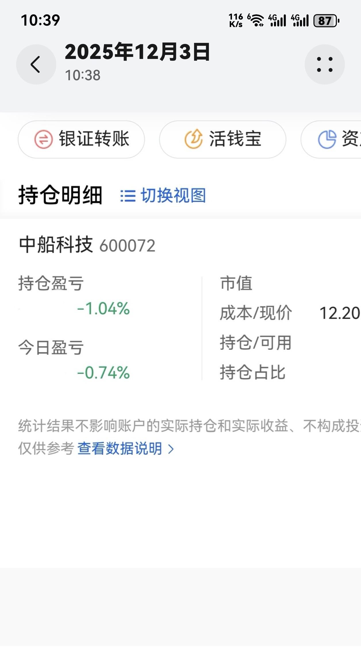 $中船科技(SH600072)$ 亏1点多了,要择机补仓,把12.2元成本价再降一才行!