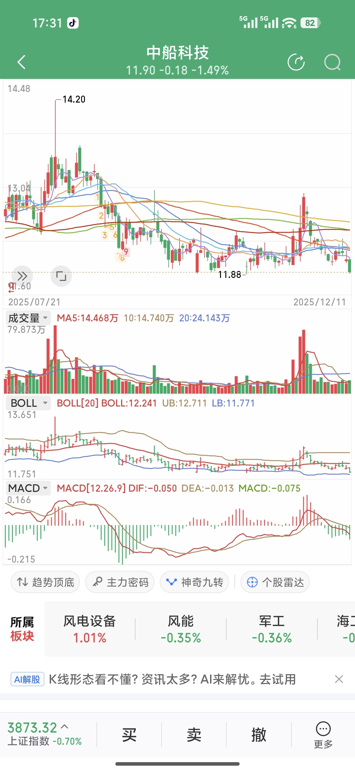 $中船科技(SH600072)$ 回头在看11月24日那天的天量是庄家和主力乘机拉高跑路了,留下套牢的价值投资散户在这里生不如死!太惨了!趋势没有走好之前,绝对不要补仓!这是最后的建议!