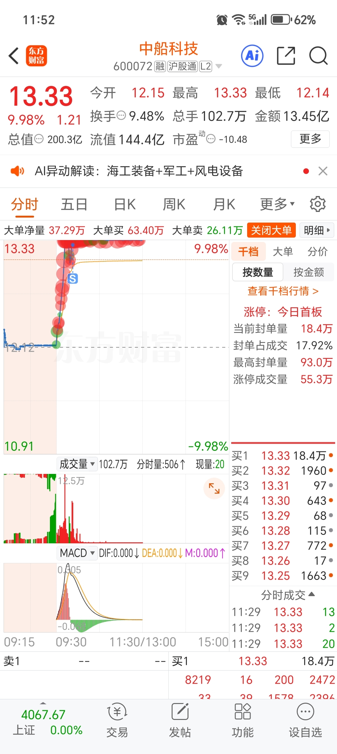 $中船科技(SH600072)$ 养成了涨停就卖的习惯,也没办法