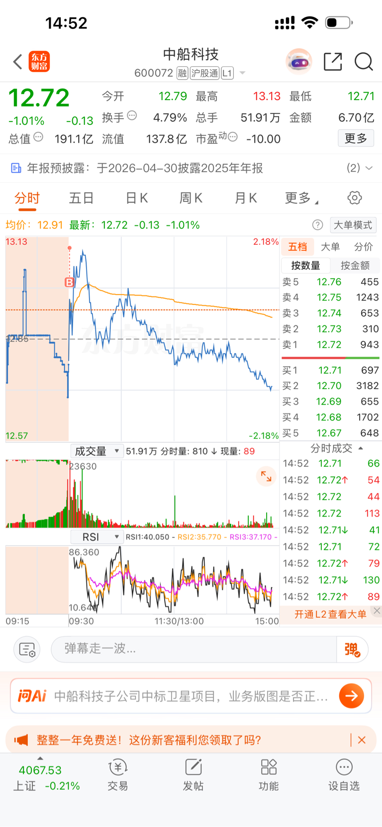 $中船科技(SH600072)$ 加仓加到彩虹之巅了