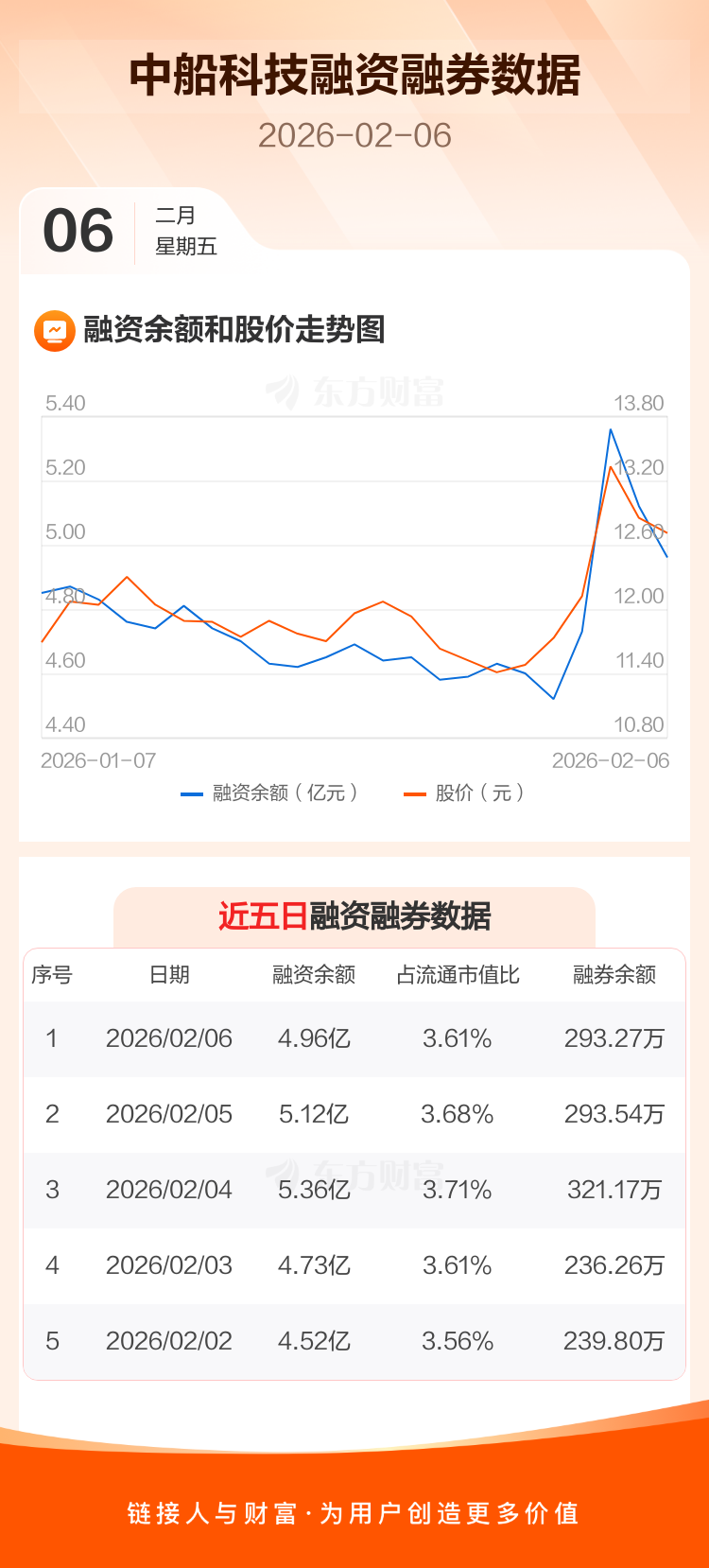 交易所最新数据显示,中船科技于2026年2月6日获融资买入5785.96万元,融资偿还7351.35万元,当日融资净偿还1565.39万元。目前,该股融资余额4.96亿,占流通市值比例为3.61%。