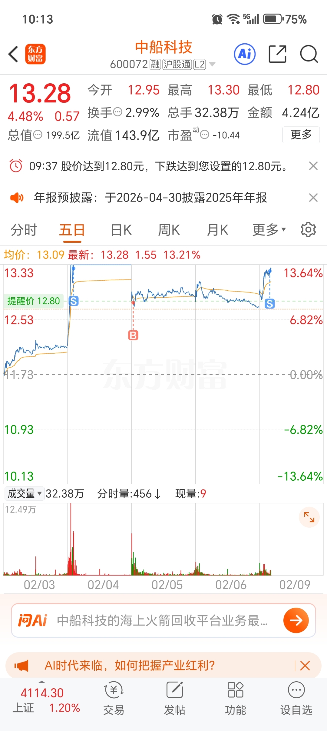 $中船科技(SH600072)$ 不卖不涨,帮大家一把
