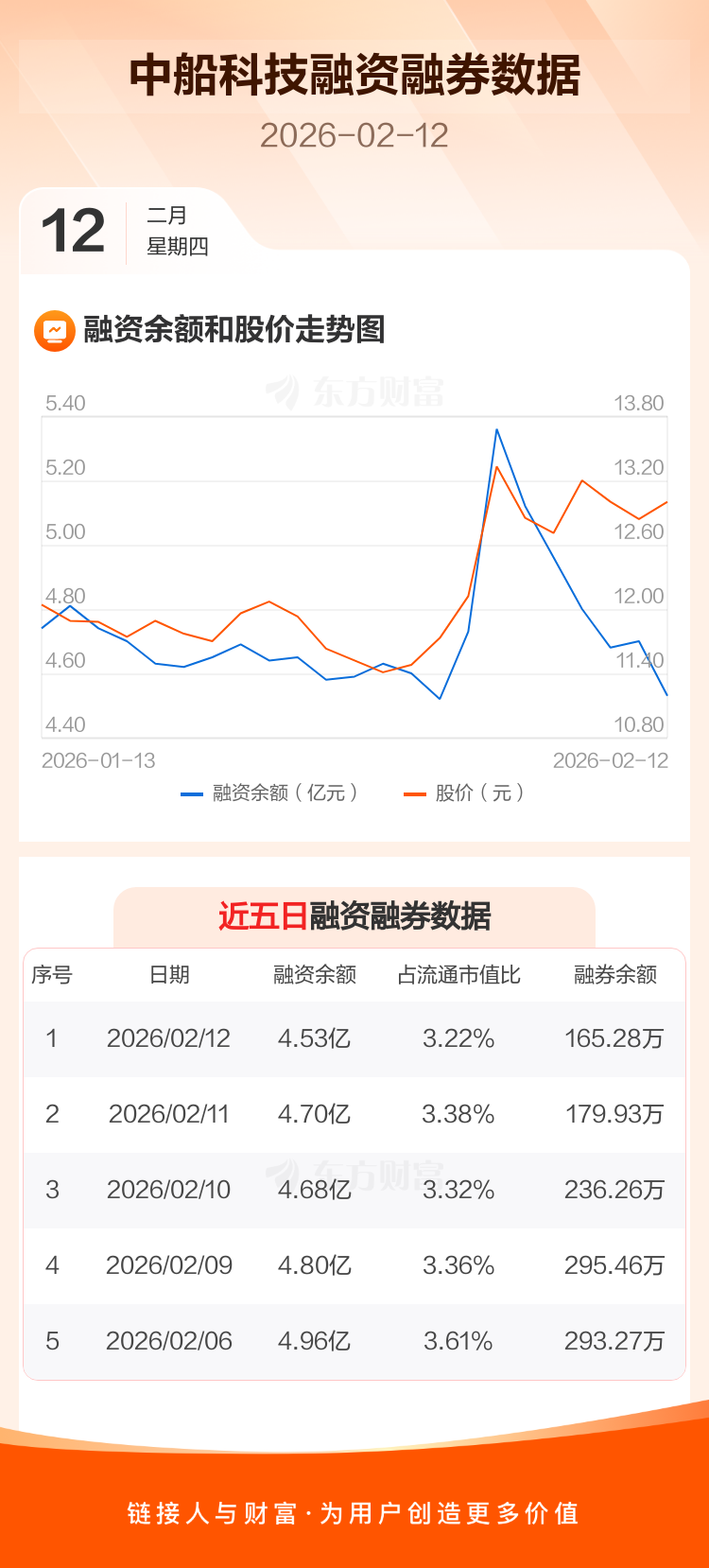 交易所最新数据显示,中船科技于2026年2月12日获融资买入5244.15万元,融资偿还6909.56万元,当日融资净偿还1665.4万元。目前,该股融资余额4.53亿,占流通市值比例为3.22%。