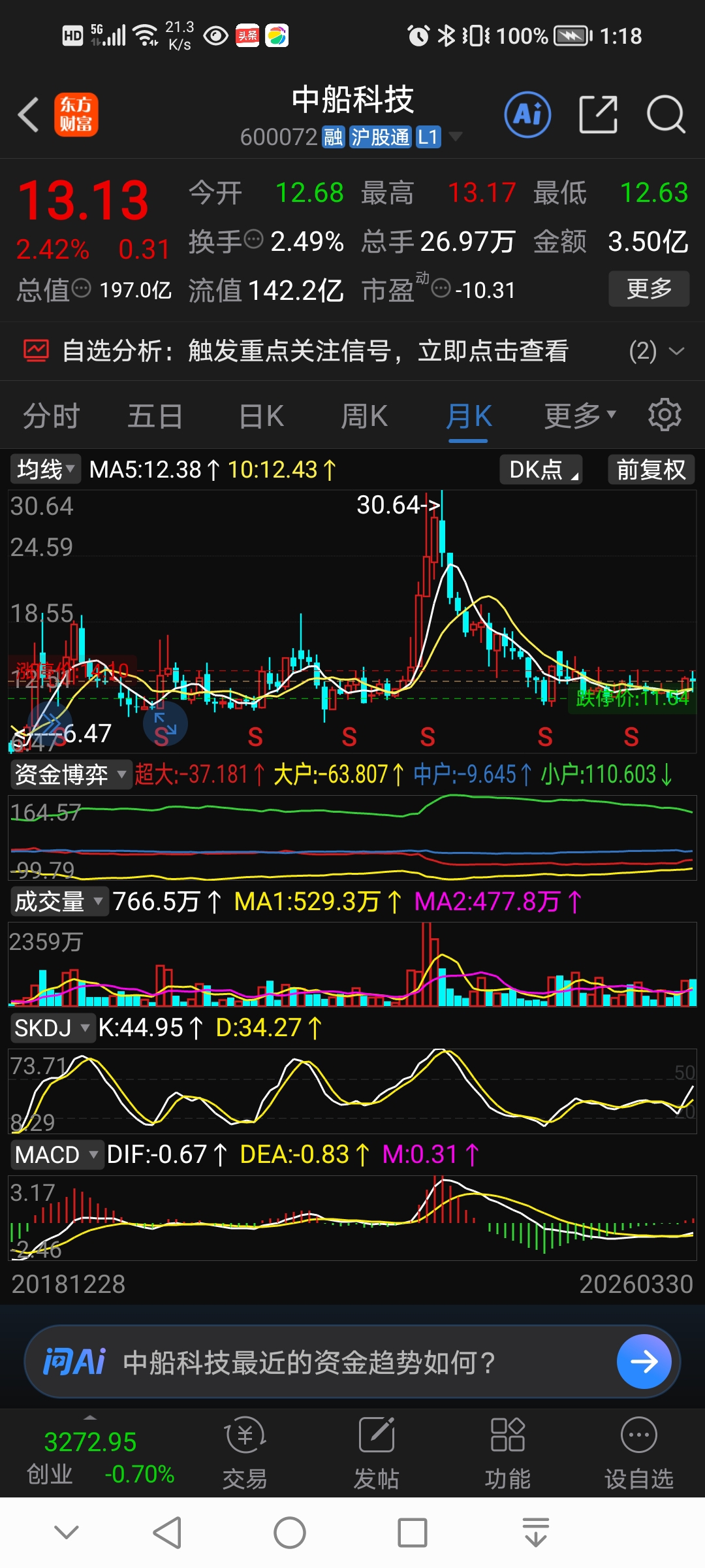 $中船科技(SH600072)$ 一个年的下跌,回踩起点,反复震荡磨底。