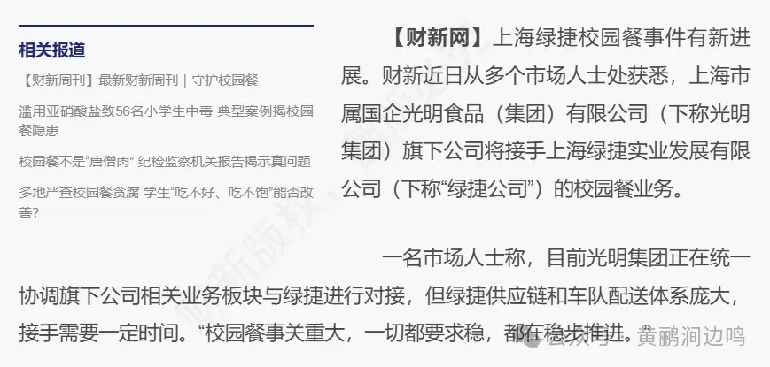 $光明肉业(SH600073)$ 财新网报到,光明接手绿捷