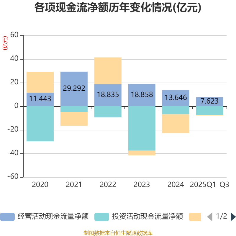 2025年前三季度,公司经营活动现金流净额为7.62亿元,同比下降26.32%;筹资活动现金流净额-4530.44万元,同比增加16.05亿元;投资活动现金流净额-7.38亿元,上年同期为-6.25亿元。