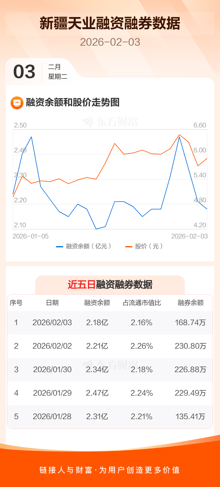 交易所最新数据显示,新疆天业于2026年2月3日获融资买入2251.38万元,融资偿还2553.51万元,当日融资净偿还302.13万元。目前,该股融资余额2.18亿,占流通市值比例为2.16%。