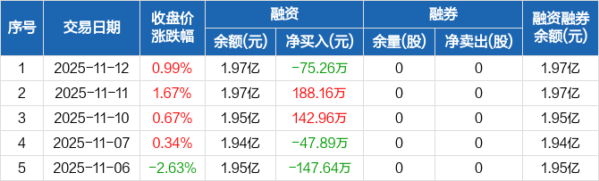 康欣新材:融资净偿还75.26万元,融资余额1.97亿元(11-12)