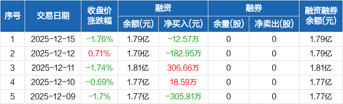 康欣新材:融资净偿还12.57万元,融资余额1.79亿元(12-15)