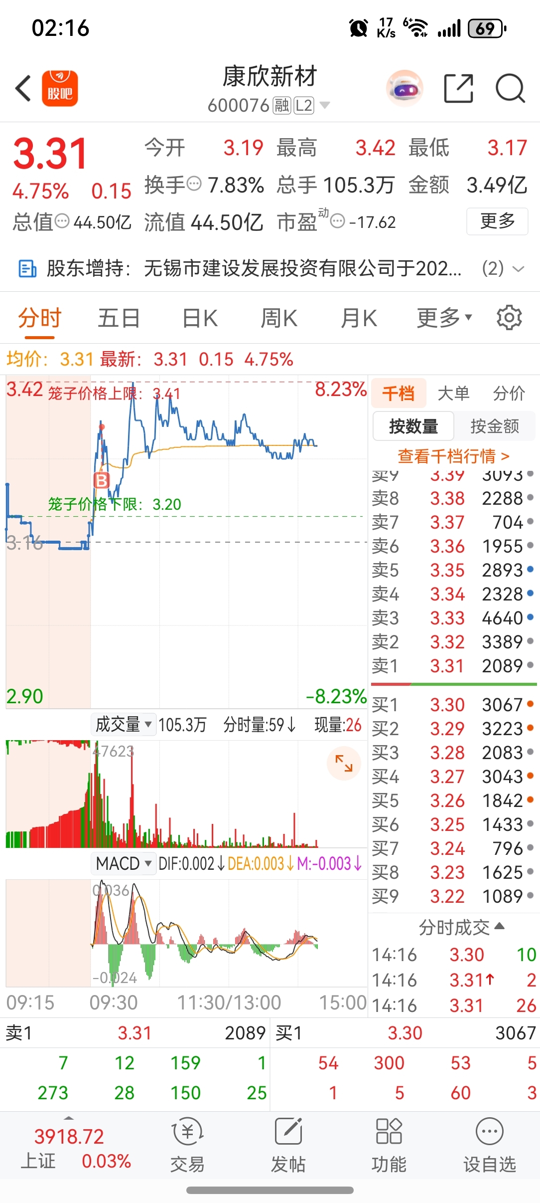 $康欣新材(SH600076)$ 不用想了 收盘应该在我买的点位3.34