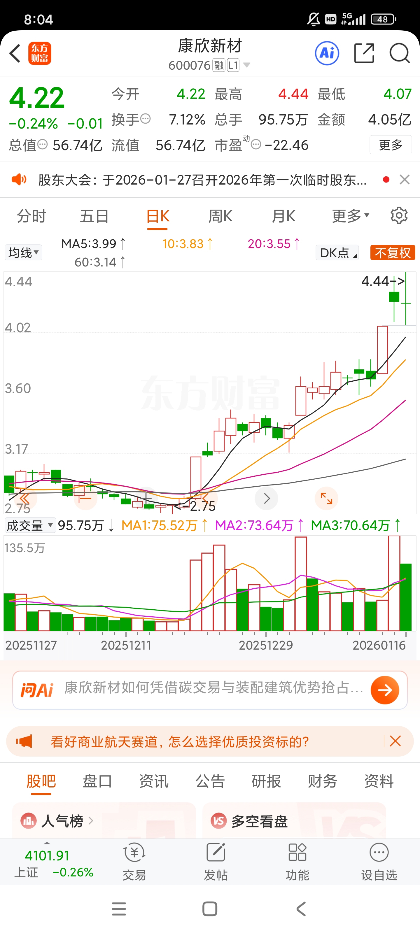 $康欣新材(SH600076)$ 周六日备了5W资金周一进场选股买入。打算买入康欣新材和盈新发展。盈新看竞价,高开太多就放弃。选择康欣新材,前期上涨已有两个向上跳空缺口,明天竞价个人觉得会小幅高开,猜下开盘价在4.25-4.3之间。全仓持有的宝鹰不清仓只做T。