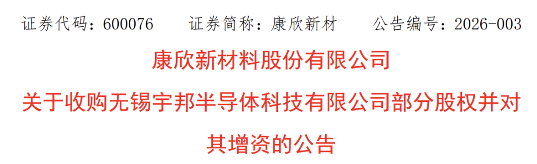 1月20日晚间,康欣新材(600076)披露,上市公司拟通过受让股权加增资的方式使用现金3.92亿元取得无锡宇邦半导体科技有限公司(简称“宇邦半导体”)51%股权。本次交易不构成关联交易,亦不构成重大资产重组。