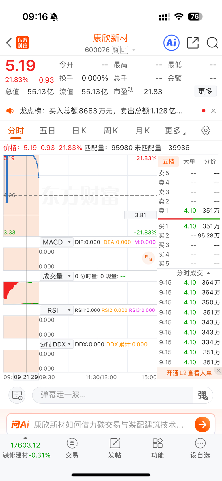 $康欣新材(SH600076)$ 不是竞价21.83%是怎么来的?