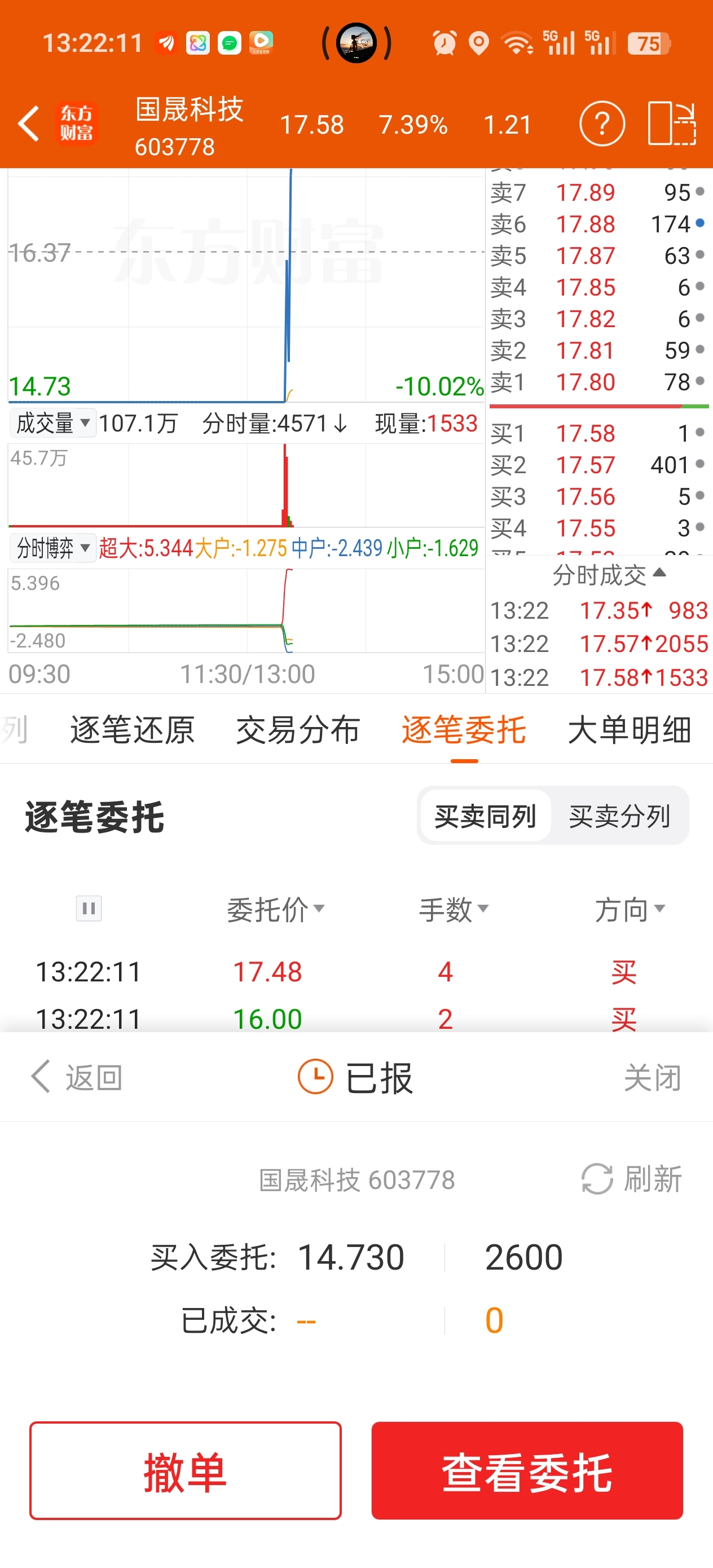 从早上挂跌停买单一直没成交刚才撤单去国晟科技,可以这边撤单那么挂买单一下子就来不
